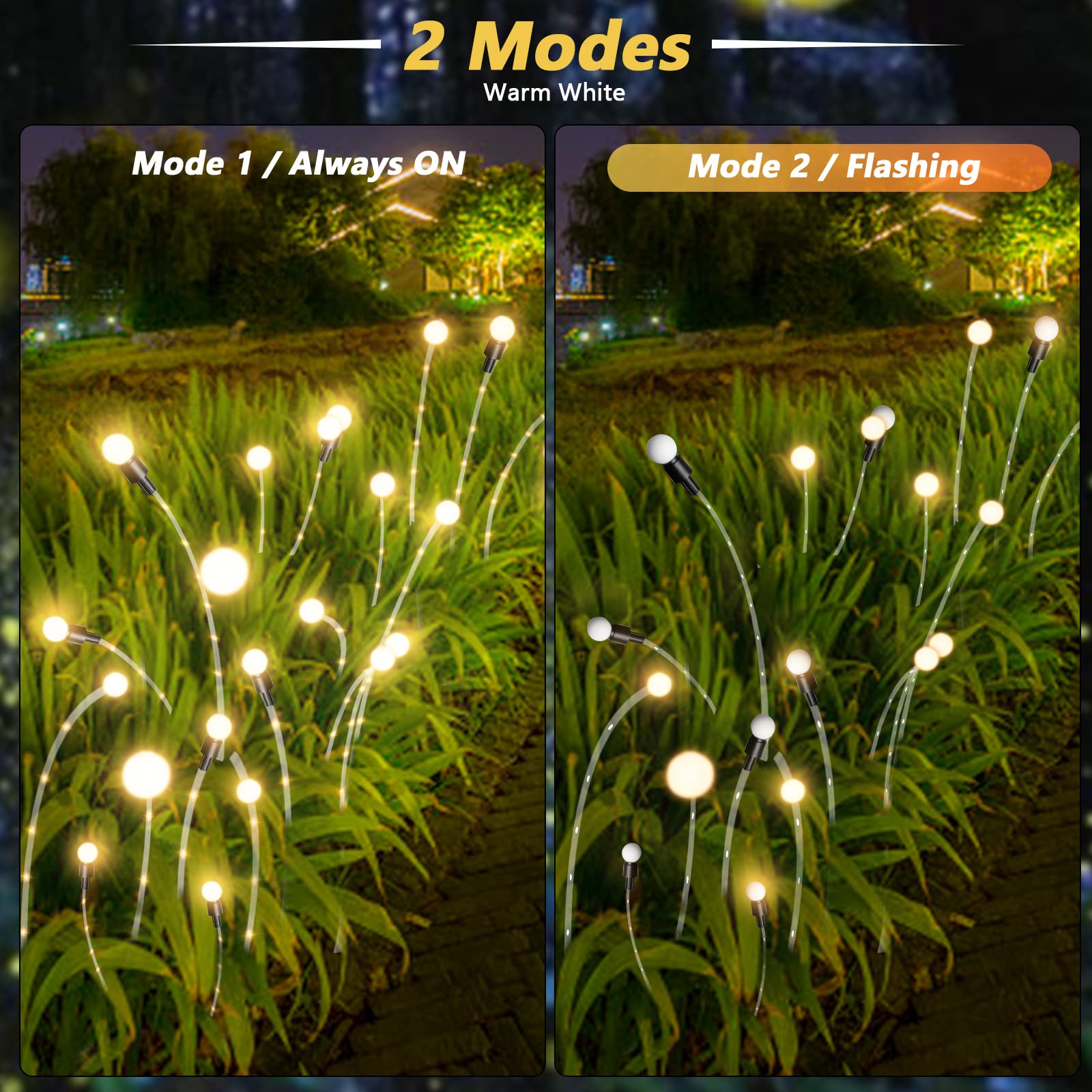 ⭐TVÅ BELYSNINGSLÄGEN: 2 belysningslägen, varmvitt blinkande och fast sken. Vrid omkopplaren till ”2” för ”fast sken” och till ’1’ för ”blinkande sken”. Fantastiskt för att skapa en vacker bild av en grupp eldflugor som flyger och dansar glatt i din trädgård, på uteplatsen eller på gräsmattan.